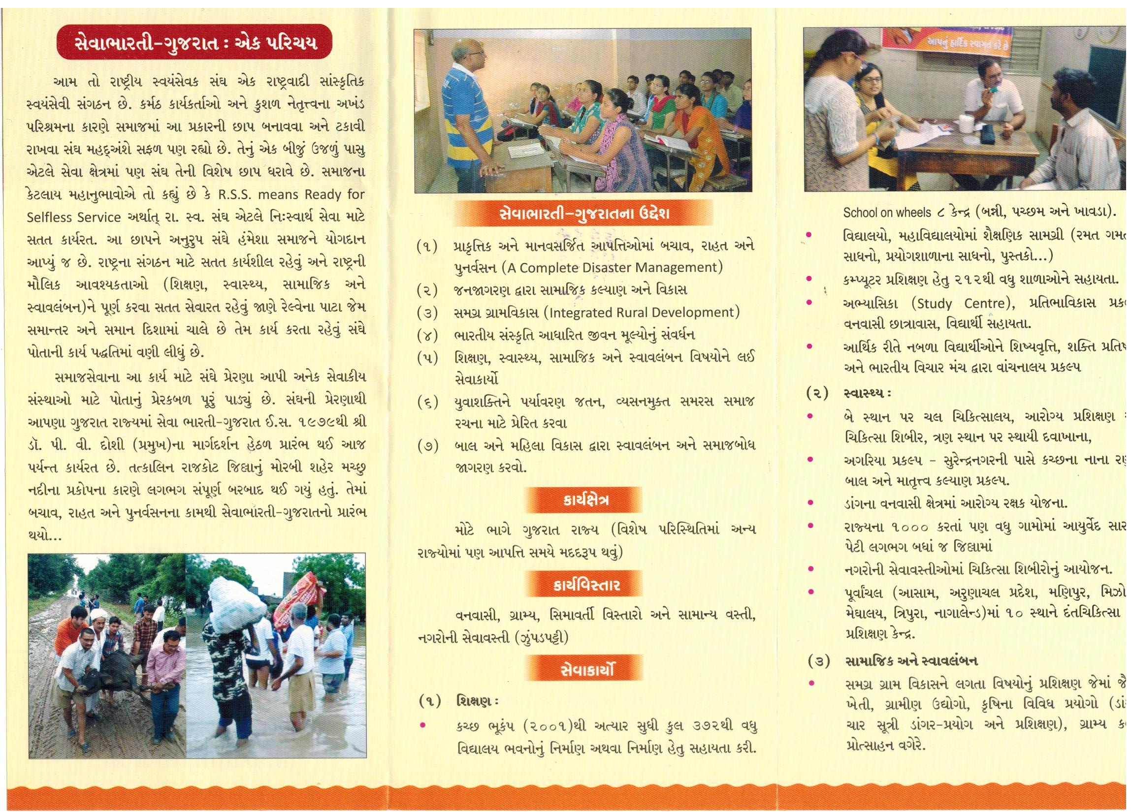Sewa Bharati-Gujarat was founded in the year 1979. Organization had resolved to work for welfare of the economically weaker sections of the society. We mainly work for Natural and Man-made Disaster, Remote Tribal Communities & Urban Slum Residents. Education, Health, Skill Development, Rural Development & Communal Harmony, Social awareness & integration are the main areas of work.We operate different centers in State of Gujarat and work in 33 districts and 4 Mahanagars (Surat, Vadodara, Karnavati and Rajkot)